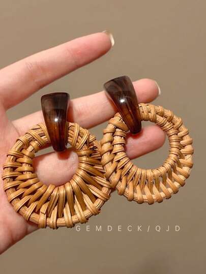 一对复古竹藤耳环,高端时尚耳钉,独特的海滩风格珠宝 - 卡其色 - 查看 1