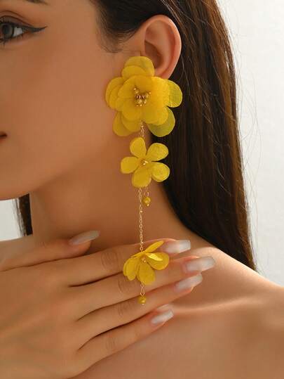 1 对女士优雅布艺花朵长耳环,适合日常佩戴 - 黃色 - 查看 1