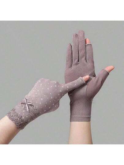 1双女士小圆点蕾丝防紫外线防滑驾驶手套,薄款触摸屏丝绸长手套秋季配饰 - 彩色 - 查看 1