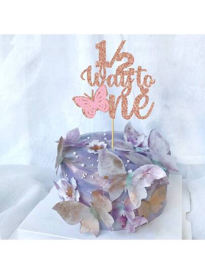 1个蝴蝶造型蛋糕装饰插牌,闪闪发光,适合1/2岁生日或6个月生日,可用于婴儿派对、半岁生日派对等,浅粉色