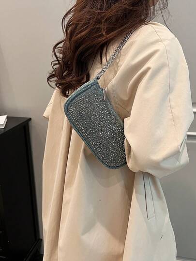 1個通勤包鉚釘袋子肩袋攜帶式,適用於秋冬節日工作學校時尚鉚釘裝飾牛仔材料,適用於大學生女人少女辦公室工作者愛人送禮使用 - 綠色 - 查看 1