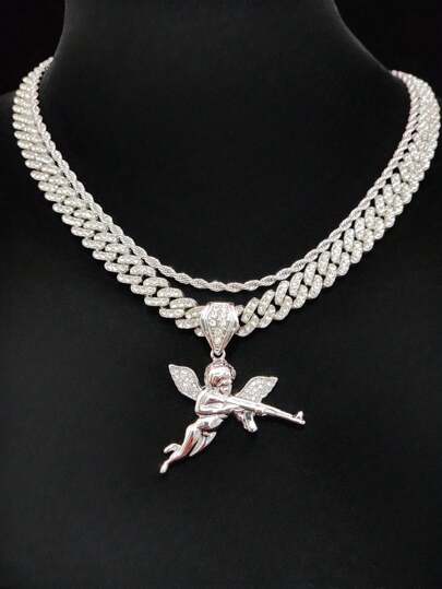 1 件时尚创意男女通用嘻哈天使吊坠项链,适合派对或日常佩戴,2 种链条款式可选 - 銀色 - 查看 2