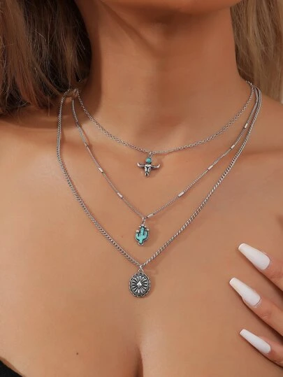 1入西部風格的綠松石裝飾仙人掌牛頭墜飾,古董銀層次鍊式項鍊,女性適用 - 復古銀色 - 查看 1
