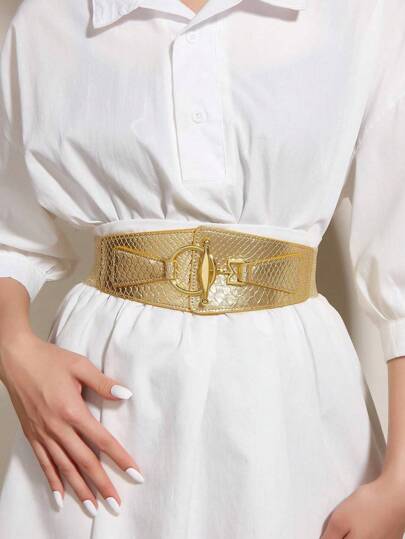 1入女士金色蛇皮革扣帶彈性腰帶,適用於日常穿著不同類型的洋裝和外套 - 金色 - 查看 1