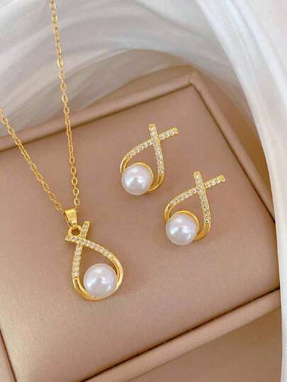1 件女孩十字珍珠项链链配白珍珠项链耳环,个性化风格耳环和项链套装, - 均碼 - 查看 1