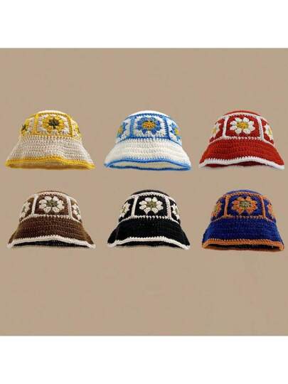 1頂女性花卉多色鉤針時尚漏斗帽,手工編織毛帽適用於街頭、海灘、派對,ins Y2k韓系波霸 - 彩色 - 查看 1