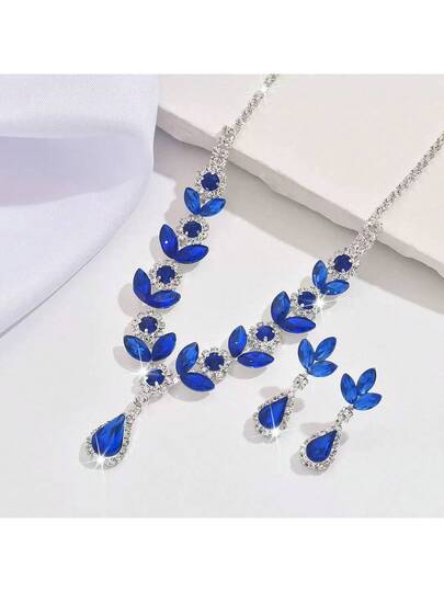 一套蓝色水晶花朵吊坠耳环项链首饰套装,优雅时尚奢华高端耳环项链,适合婚礼新娘、派对礼服配饰 - 藍色 - 查看 1
