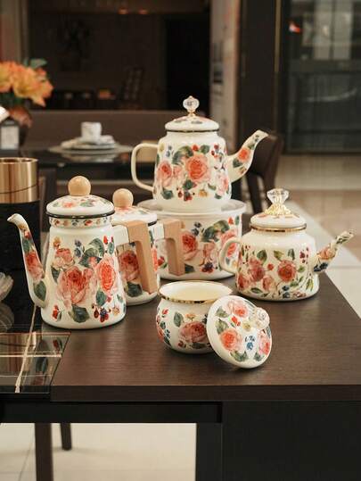 1 套珐琅玫瑰系列茶壶、储物罐、炉边茶珐琅茶壶、咖啡壶、茶叶罐、咖啡豆罐、咖啡渣罐、装饰珐琅壶和罐、送给朋友和长辈的礼物、厨房直热珐琅壶、家用珐琅糖罐、调味罐、咖啡豆罐、茶叶罐、辣椒酱罐、零食罐 回到学校 - 米色 - 查看 6