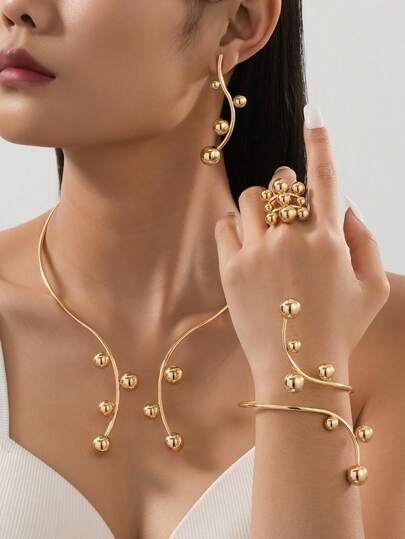 1 套时尚优雅几何线条大号和小号金珠项链手链戒指耳环首饰套装,适合女士、派对佩戴和礼物 - 金黃色 - 查看 1