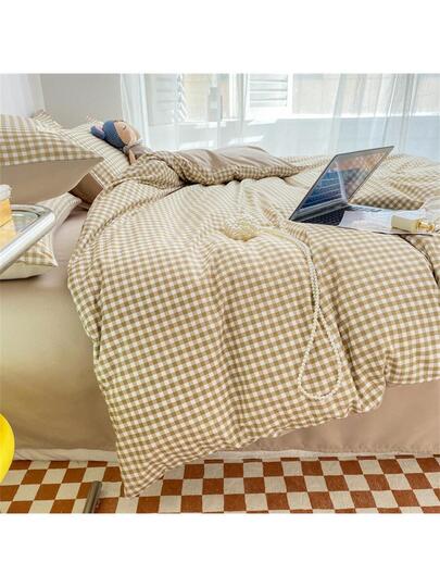 1套新款格子素色雙拼床單套裝,家用被子,學生宿舍 - 米色 - 查看 1