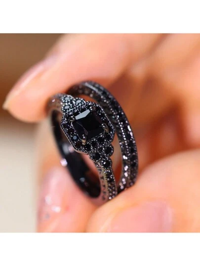 1套裝的2時尚環帶人造方晶鋯石鑲嵌,獨特和個人黑色色調婚禮,訂婚,和結婚戒指禮物適用於朋友們 - 黑色 - 查看 1