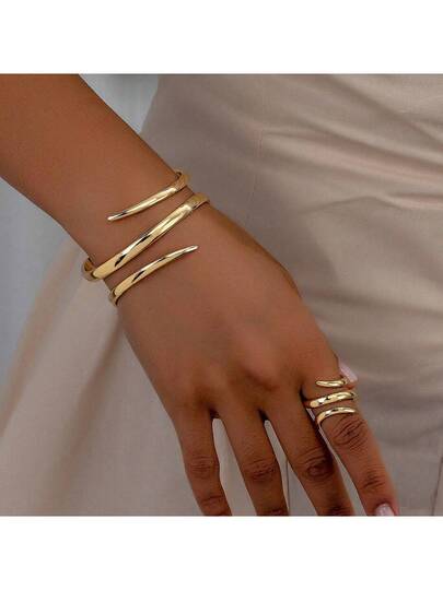 1 套复古欧美风格金色几何线条手链和粗戒指组合套装,时尚耐用防褪色粗手链和戒指首饰套装,适合女性日常佩戴、各种节日、社交聚会和情侣礼物 - 金色 - 查看 1