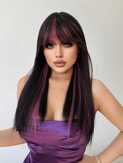 1 合成耐热假发,带刘海,多色长直假发,22 英尺长,由纤维制成,适合日常使用,自然仿真假发 - 彩色 - 查看 2