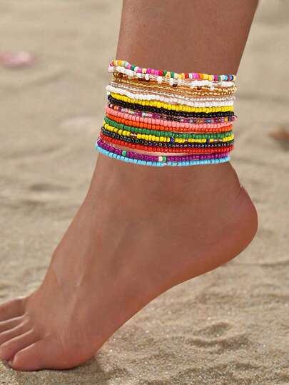 10/20/30/50 件/套随机颜色和款式波西米亚风弹性脚链,百搭时尚珠宝礼物,适合男士和女士,日常穿着和海滩 - 彩色 - 查看 1