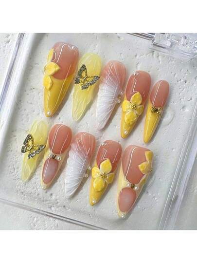 10 PCS Handmade 2025 Press - On Nails | SunnyButterfly Acrylic Nail Art With Yellow - Pink Hues And Pearl Details