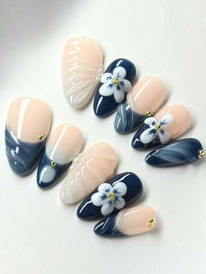 10片/套 手工亚克力按压式美甲贴片,中长杏仁形美甲,法式美甲,蓝色美甲,3D手工树脂花朵,3D条纹,3D雕刻美甲,渐变美甲。美甲用品,假指甲,可卸假指甲,美甲配件,美甲艺术,适合派对、舞会、日常佩戴、学生派对、角色扮演,按压式可重复使用,附赠果冻胶和指甲锉,DIY美甲用品。
