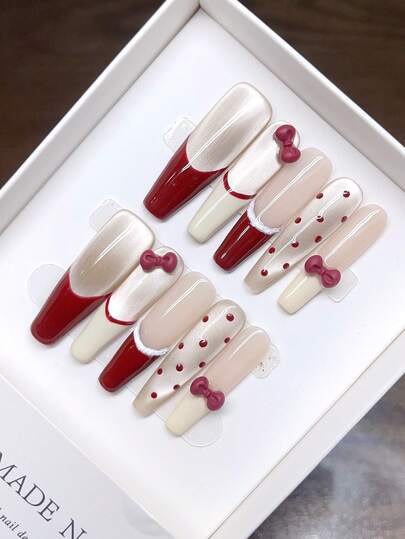 10片纯手工绘制的可佩戴美甲贴片,包含3D蝴蝶结、猫眼、波点、樱桃红法式美甲等款式,可个性化定制,按压式美甲贴片,美甲用品 - 彩色 - 查看 10