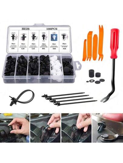 100/101/105/130个汽车通用卡扣混合塑料紧固件夹,带拆卸紧固工具,适用于汽车保险杠、车门装饰固件夹套装 - 無色 - 查看 1