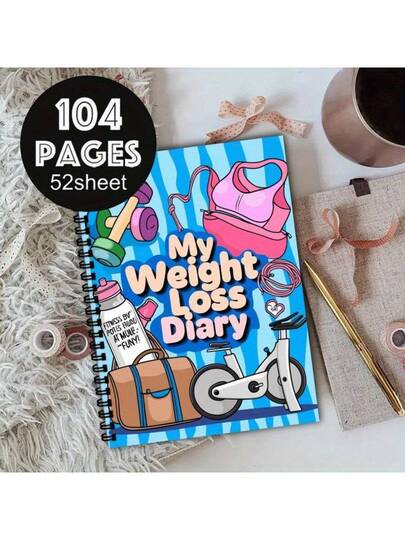 104页A5减肥日记,包含健身器材设计、每日和每周饮食追踪、循序渐进的饮食计划、激励目标追踪器,用于实现目标体重,以及自律指南