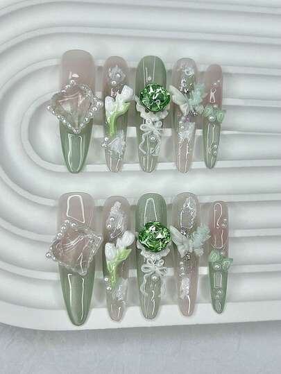 10片装优雅奢华祖母绿法式手工按压式美甲贴片,3D钻石蝴蝶花朵珍珠假指甲,猫眼杏仁美甲美甲用品(1张果冻贴纸+1把指甲锉) - 綠色 - 查看 10
