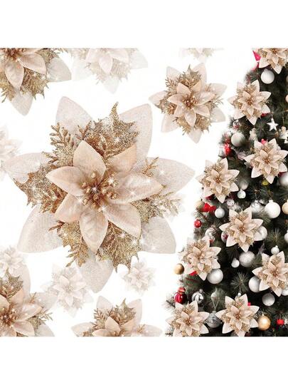 10件装闪光一品红人造花摆件,花卉装饰,闪光一品红花瓶摆件,适用于家居装饰、派对、婚礼、情人节装饰,香槟金配色,是生日、圣诞节装饰、房间装饰、冬季圣诞节装饰、家居圣诞礼物、圣诞装饰的理想之选。 - 彩色 - 查看 8