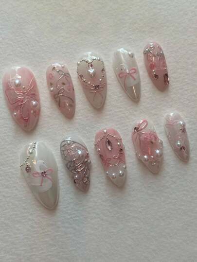 10 件手工制作的欧美风格按压式指甲,带有 3D 花卉、珍珠、海螺、光泽和裸白色双色短杏仁形假指甲,适合女性和女孩的礼物美甲用品