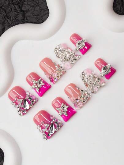 10片/套 手工法式美甲 Y2K 风格亚克力假指甲,裸色和粉色,法式贴片,饰有水钻、蛇形、花朵、星球、星星图案。适合派对、活动、日常佩戴,女士和女孩皆宜。包含美甲工具,是送礼佳品。按压式假指甲,美甲用品,手工按压式假指甲。