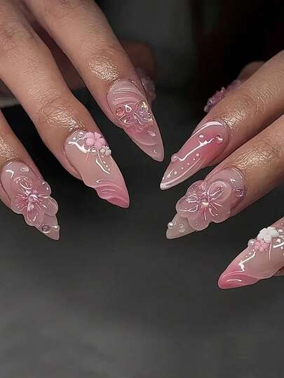 10 件 Xs/S/M 粉色按压指甲带饰中号杏仁假指甲 3D 手工指甲,蝴蝶贴指甲可爱法式指甲按压杏仁形丙烯酸指甲女士日常佩戴美甲用品指甲 - 粉色 - 查看 5