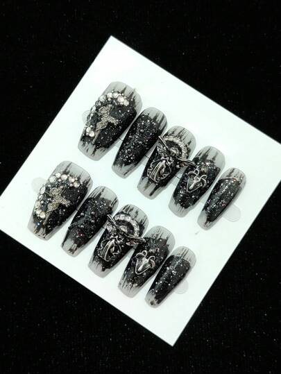 10 件手工制作深色哥特风格可重复使用指甲环圆形水钻包括工具包