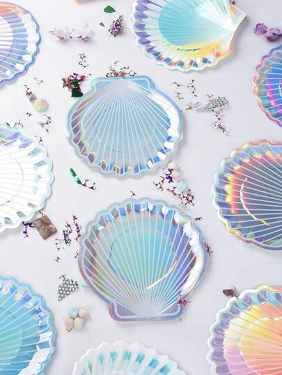 10个全息美人鱼贝壳纸盘,一次性彩虹色纸盘,美人鱼主题派对用品,海洋主题装饰,夏季生日派对婚礼派对