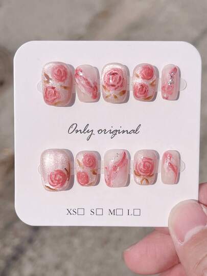 10片粉色手工按压式美甲贴片,短款方形猫眼美甲,亚克力材质,带彩绘花朵。美甲用品,覆盖,假指甲片,女士和女孩人造指甲,纯手工美甲贴片