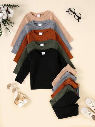 10件套男童休闲纯色柔软舒适华夫格针织长袖上衣和裤子套装 - 彩色 - 查看 1