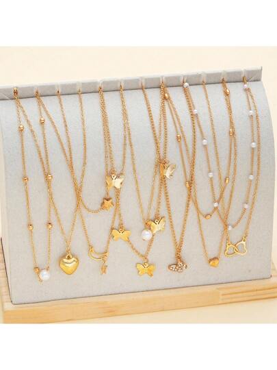 10 件套简约心形蝴蝶星月亮水钻仿珍珠吊坠项链,适合女士、约会礼物、度假日常搭配(无盒)情人节 - 金黃色 - 查看 4