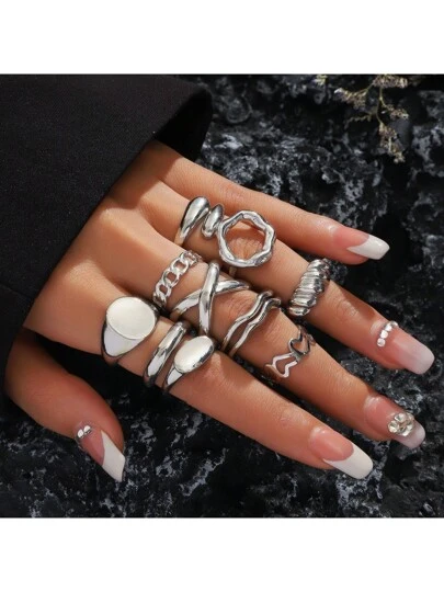 10 件/套波浪圆环设计独特十字环绕纯色戒指套装,适合女性约会、聚会、派对佩戴 - 銀色 - 查看 1
