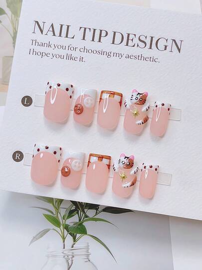 10pcs Y2K Nails Pipe-Shaped Press On Nails Set - Handcrafted, Pink Nails, White Nails, White French Tip Nails, Handmade 3D Cat And 3D Button Design, Hand Drawn Polka Dot And Stripe Pattern Decoration, Sparkling Gold Star Accents, Delicate Cute Nails - Suitable For Women And Girls, Party, Wedding, Daily Wear, Diy Nail Art, Nail Set