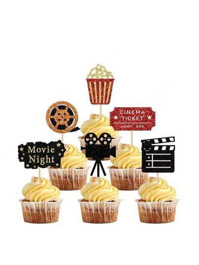 12/24 件电影纸杯蛋糕装饰电影胶卷相机爆米花纸杯蛋糕装饰适用于电影主题派对生日派对婚礼派对装饰 - 彩色 - 查看 5