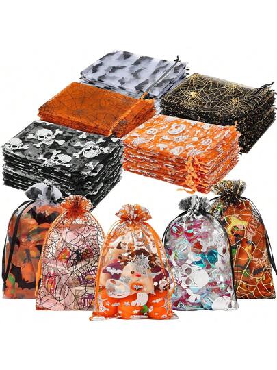 12/24 件万圣节和圣诞节欧根纱礼品袋,带抽绳封口 - 蜘蛛网、南瓜、蝙蝠和秋叶图案 - 耐用涤纶混纺糖果和派对礼品袋,适用于节日活动、万圣节配饰、季节性庆祝活动、装饰图案、闪光纹理、活动组织者 - 彩色 - 查看 1