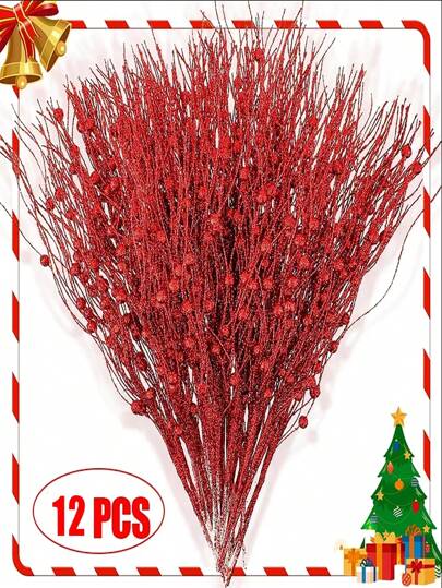 12 件圣诞树人造闪光浆果茎饰品闪光树枝家居节日圣诞派对装饰用品,圣诞节 - 彩色 - 查看 12