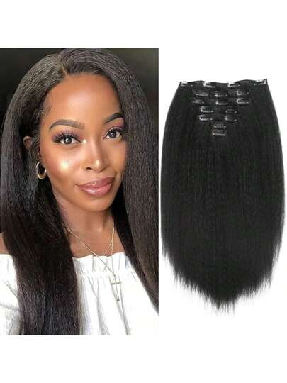 14英寸7件裝,帶有16個夾子的yaki假髮片,kinky直髮夾裝滿頭發夾,女士亮點直徑合成髮 - 自然黑 - 查看 8