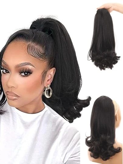 16英寸自然黑色中长波浪马尾辫,带抽绳,适合日系日常佩戴,高温丝假发 - 黑色 - 查看 1