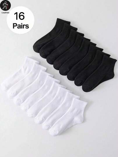 16双/套 简约黑白中筒袜,透气,防臭,亲肤 - 彩色 - 查看 1