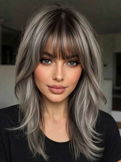 18英寸优雅灰色长卷发假发,带挑染和刘海 - 深色发根至浅色发尾,合成纤维假发,适合女性日常、派对、度假旅行(请注意佩戴和保养方法) - 灰色 - 查看 11