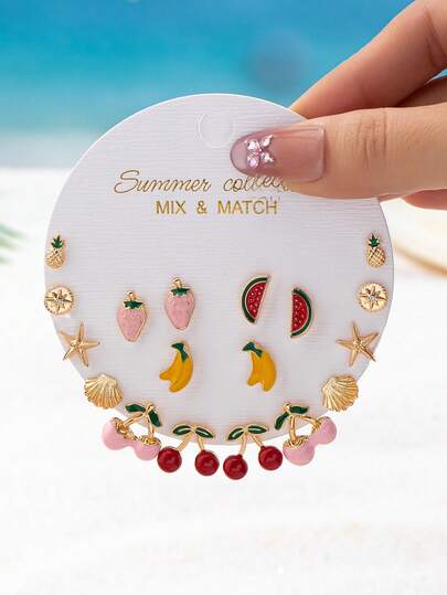 18件套极简珐琅樱桃耳环套装,镀金迷你海星耳钉,海洋水果主题首饰,适合女性日常及度假佩戴