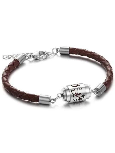 1只黑色皮革不鏽鋼香薰擴散器手鏈,男女通用復古空心吊墜香水精油擴散器手鏈 - 棕色 - 查看 4