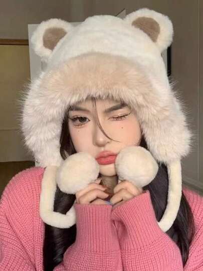 1 件帽子,多功能毛绒保暖护耳带帽,可爱熊耳毛绒帽,冬季户外骑行,日常旅行配件万圣节 - 彩色 - 查看 1