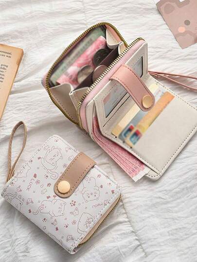 1个小猫图案按扣短款女士钱包,带按扣和拉链,可装硬币和卡片 - 多隔层零钱包/卡包 - 大容量零钱包 - 便携式卡包,适合女性,迷你钱包,小钱包,可爱钱包,送礼佳品。 - 彩色 - 查看 2