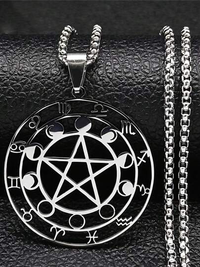 1件新款精美不锈钢巫术十二生肖占卜五芒星月相吊坠项链女士幸运饰品