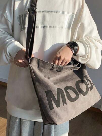 1 件复古帆布图案单肩包学院风学生大容量手提包斜挎包易于携带的时尚收纳包节日派对小礼物(不同批次颜色可能略有不同)2000 年代风格街头服饰 - 深灰色 - 查看 2