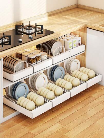 1個不銹鋼拉出式櫥櫃組織架,固定於膠粘納米膜上,廚櫃滑動式碗碟瀝水架,碗碟抽屜儲物盒,廚房下水櫥抽屜組織架