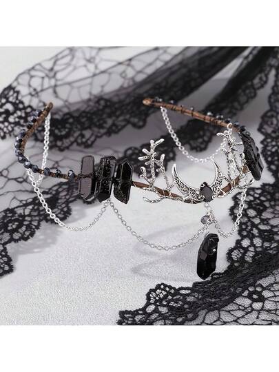 1 件复古黑水晶月亮皇冠头饰 - 手工编织哥特式精灵头饰,适合派对发饰,适合角色扮演摄影、万圣节 - 彩色 - 查看 1